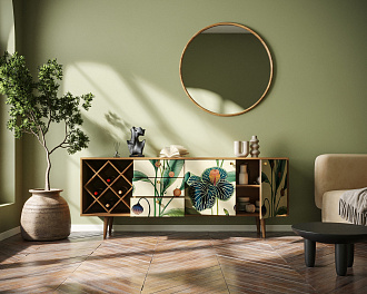 Комод "Berber" удлиненный с бутылочницей принт 7. Удлиненный комод "Berber" снабжен бутылочницей, тремя небольшими ящиками, а за дверцами пространство разделено полкой. Комод функционален и может служить тумбой под TV, дополнением к дивану в гостиной, который зонирует пространство комнаты или быть самостоятельным арт-объектом.