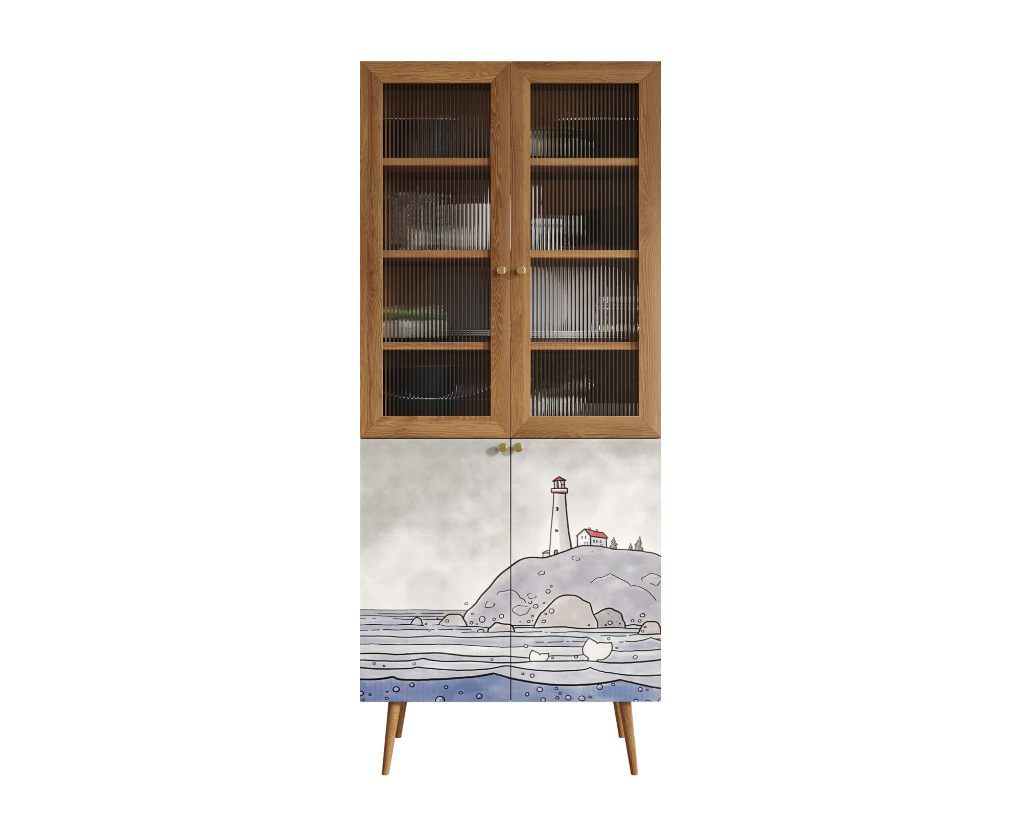 Малый буфет "Berber" имеет верхнее отделение с рифлеными дверками в раме из натурального ясеня и нижнее, дверки которого покрыты дизайнерским принтом. Пространство за дверками поделено на несколько секций, в каждой из которой есть съемные полки регулируемые по высоте в трех режимах.