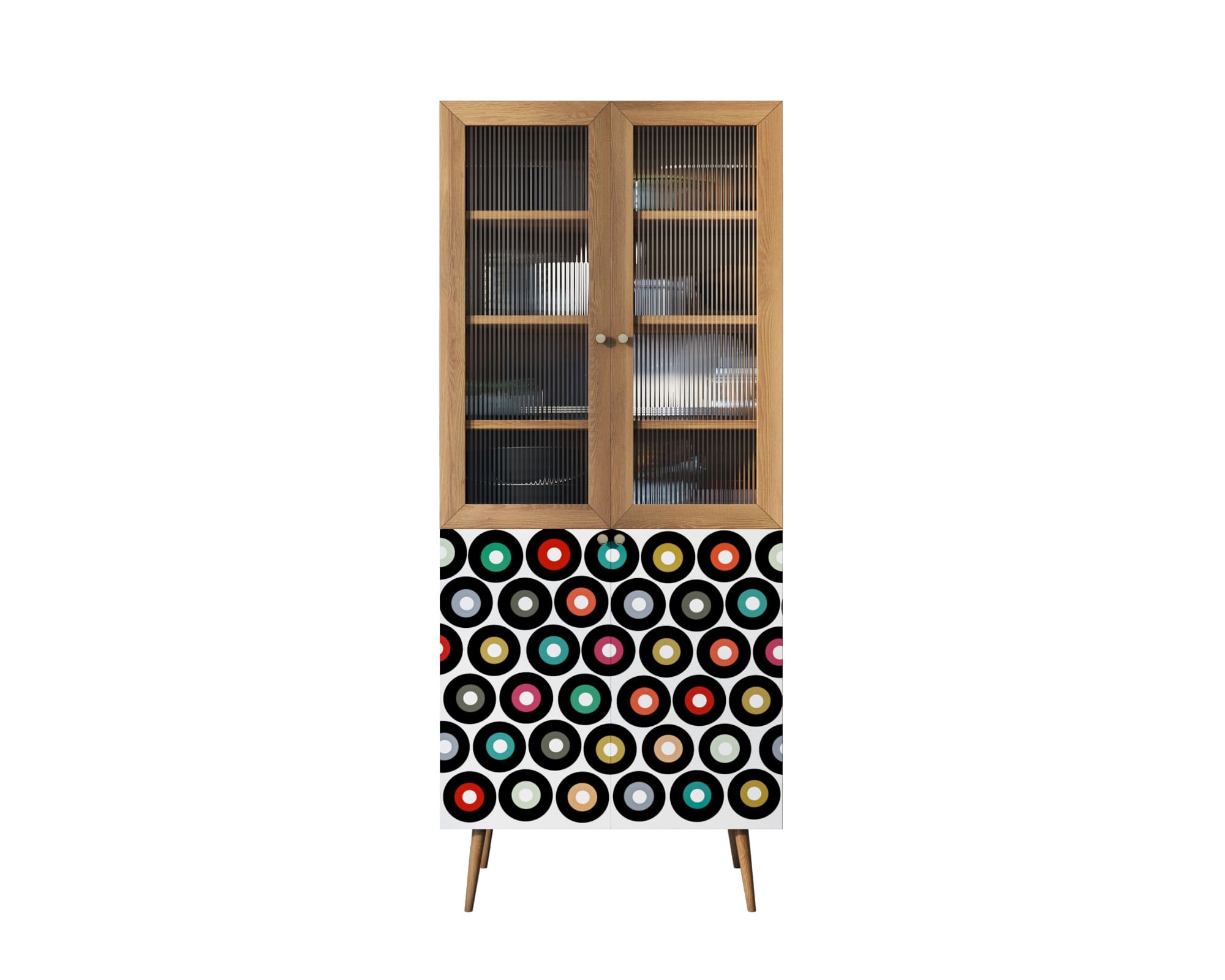 Малый буфет "Berber" имеет верхнее отделение с рифлеными дверками в раме из натурального ясеня и нижнее, дверки которого покрыты дизайнерским принтом. Пространство за дверками поделено на две секции, в каждой из которой есть съемная полка регулируемая по высоте в трех режимах.
