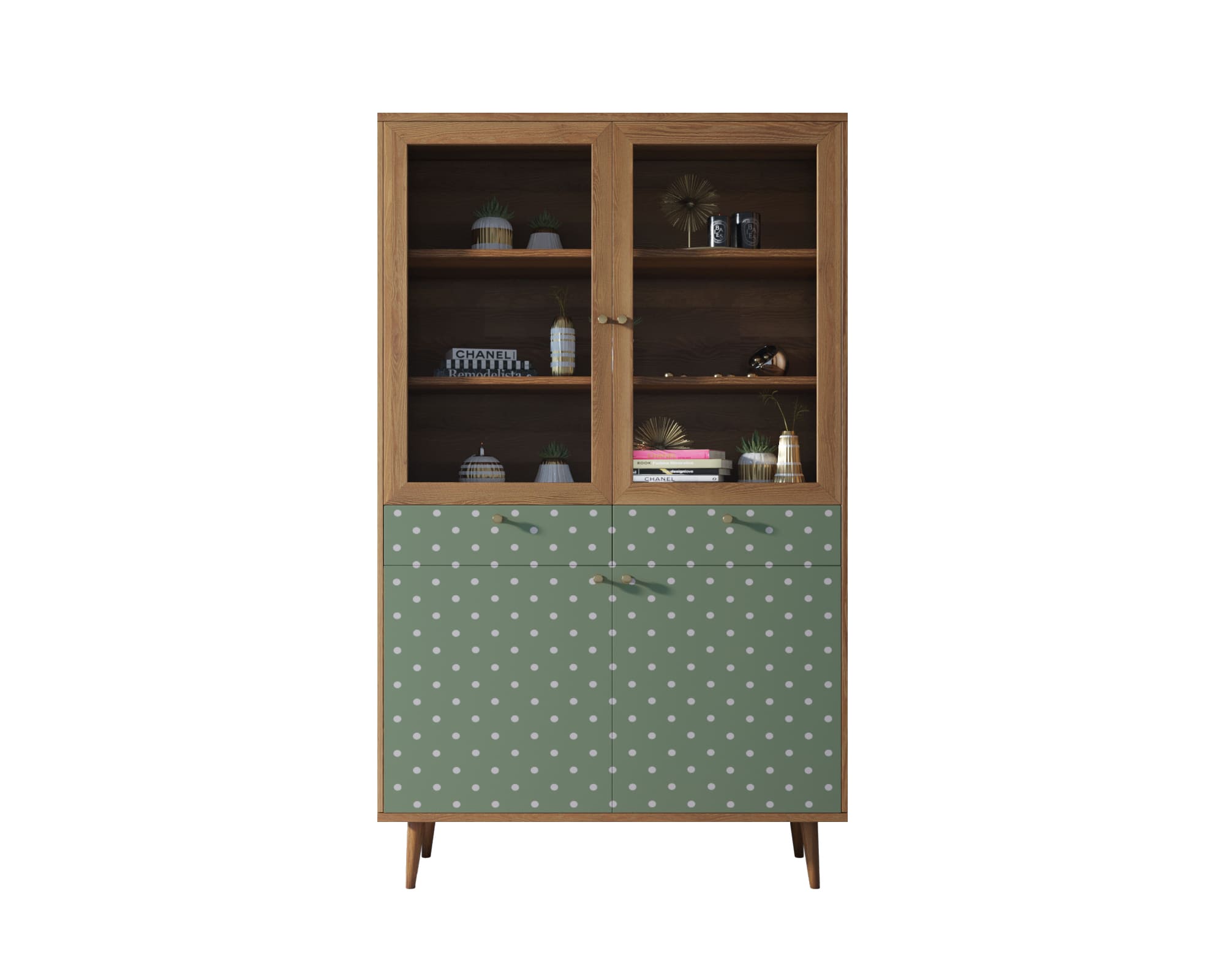 Буфет "Berber" имеет два выдвижных ящика на шариковых направляющих (могут быть заменены на доводчики по желанию). Низ буфета разделен на две секции, которые скрываются за двумя дверками, и полкой. Верхняя часть закрывается стеклянными дверцами, а на двух полках отлично расположится декор или кухонная утварь.
