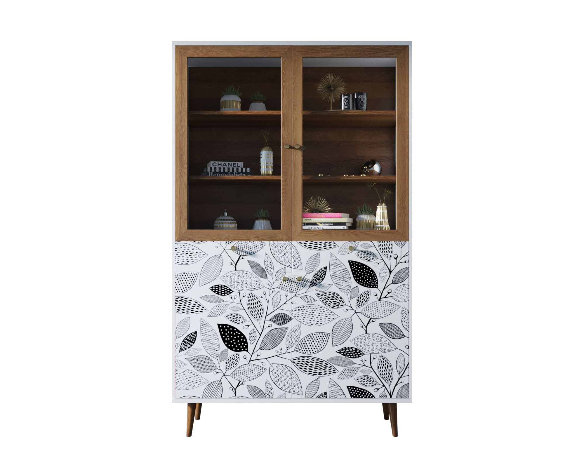 Буфет "Berber" имеет два выдвижных ящика на шариковых направляющих (могут быть заменены на доводчики по желанию). Низ буфета разделен на две секции, которые скрываются за двумя дверками, и полкой. Верхняя часть закрывается стеклянными дверцами, а на двух полках отлично расположится декор или кухонная утварь.