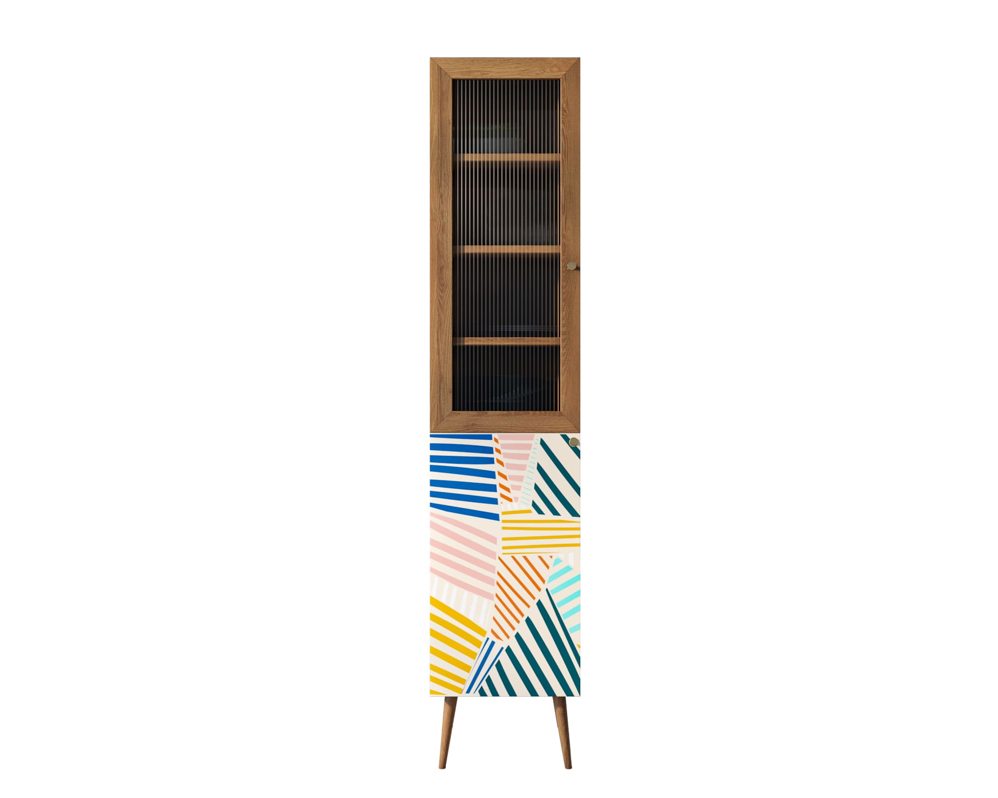 Верхняя часть оснащена прочной рифленой дверкой с рамой из массива ясеня, а нижние полки скрыты за глухой дверью с принтом, нанесенным УФ-чернилами. Благодаря этому он не выгорит, не потеряет яркости после протирания.