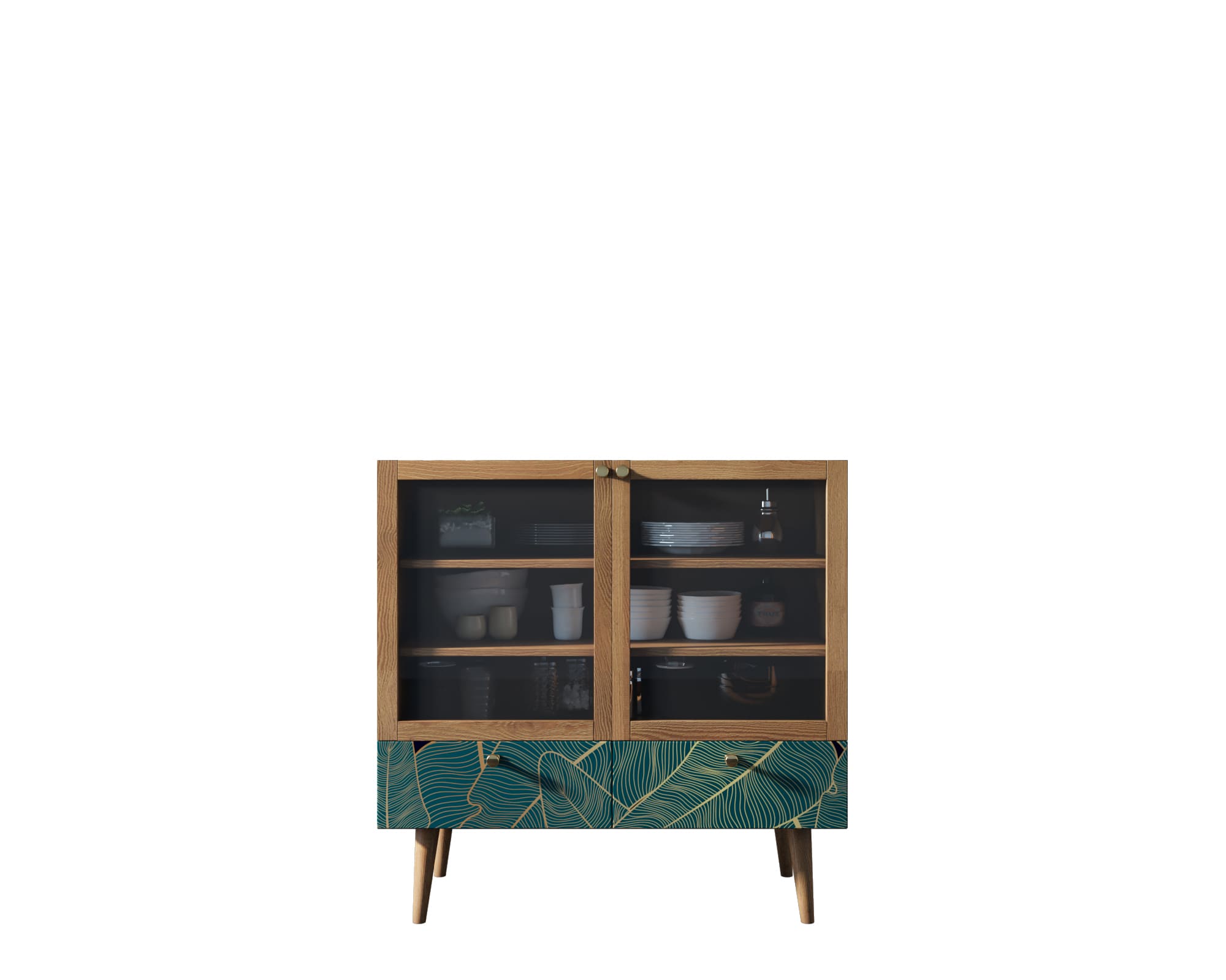 Корпус буфета выполнен из ЛДСП и разделен на три вместительных полки, скрытых за прозрачными стеклянными створками. Каркас удерживают прочные ножки из массива ясеня. Внизу есть несколько выдвижных ящиков, декорированных эффектным лиственным принтом. Низкий комод позволяет размещать предметы быта и декора на верхней панели.