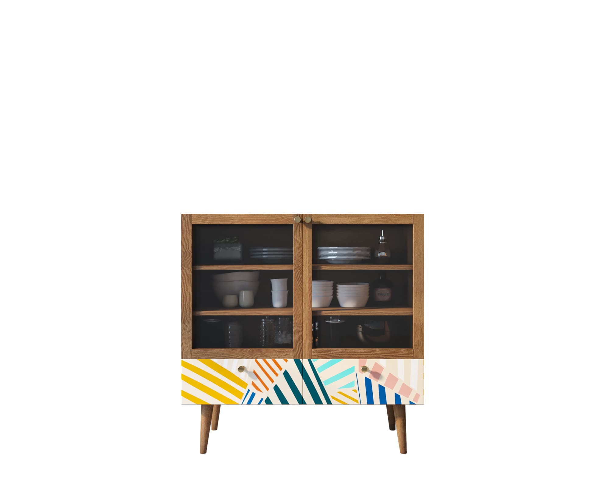 Компактный, но вместительный буфет в скандинавском стиле для посуды и кухонных приборов. Корпус и полки выполнены из ЛДСП, ножки – из массива ясеня. В модели две застекленные дверцы и нижний ящик с разноцветной облицовкой, аккуратными ручками.