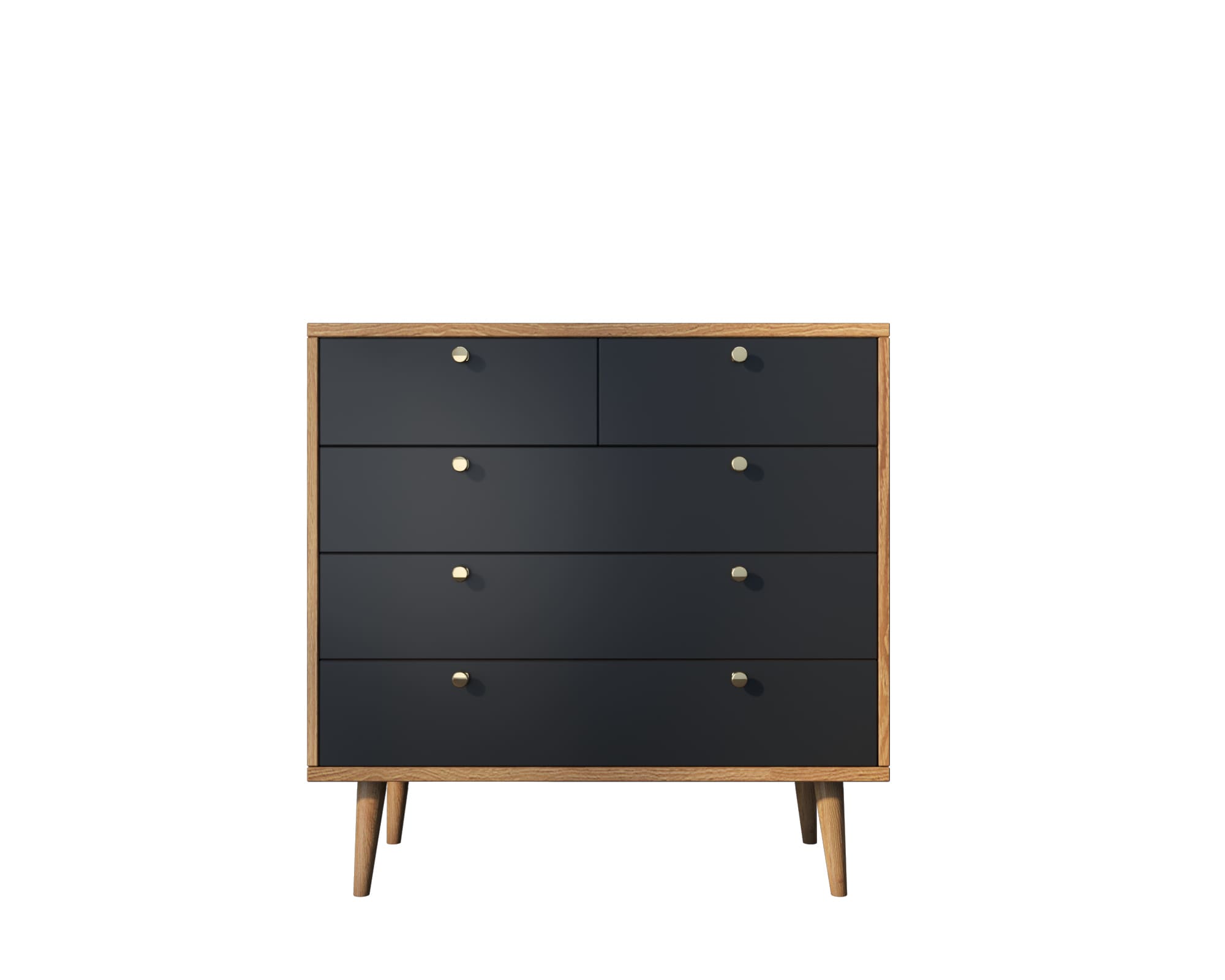 Компактная модель комода представлена пятью продольными ящиками с удобными ручками. Корпус прямоугольной формы выполнен из ЛДСП, а ножки изготовлены на основе натурального дерева. Комод привлекает внимание спокойным принтом на фасаде.