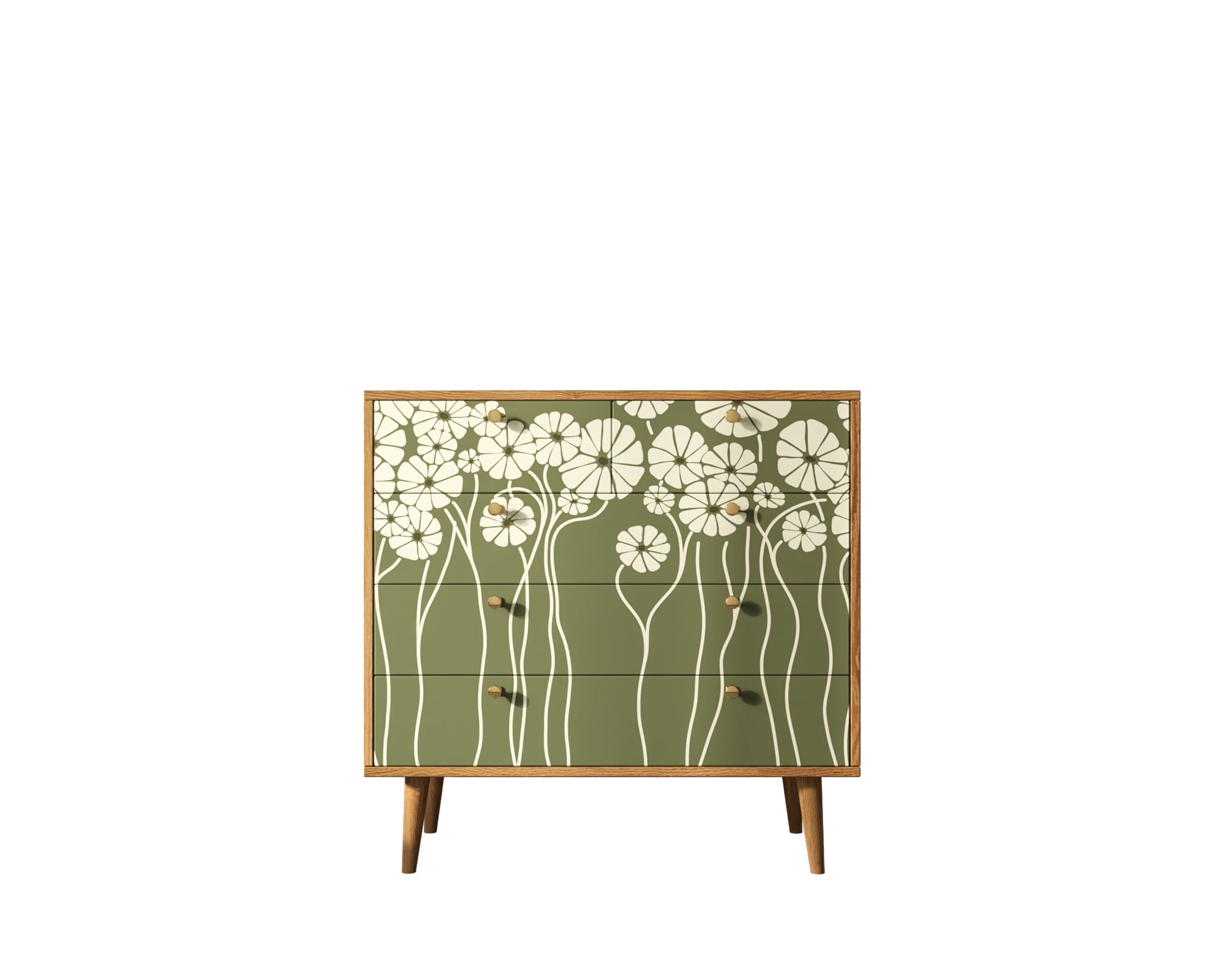 Компактная модель комода представлена пятью продольными ящиками с удобными ручками. Корпус прямоугольной формы выполнен из ЛДСП, а ножки изготовлены на основе натурального дерева. Комод привлекает внимание спокойным принтом на фасаде.
