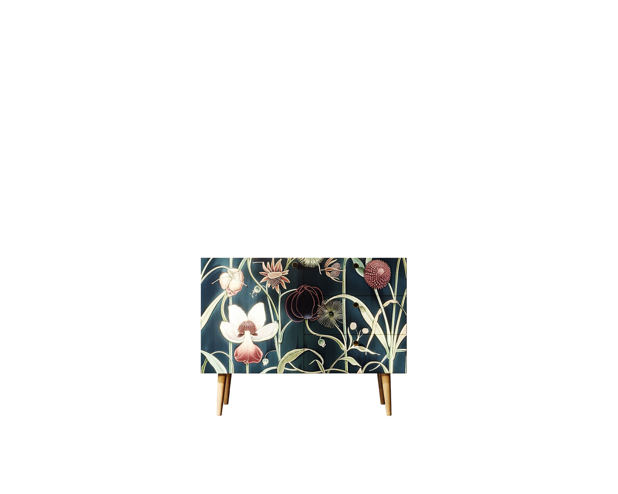В компактном комоде три ящика и полка в левой секции за дверкой. Фасад украшает принт в спокойных тонах. Петли на дверях с доводчиком, ящики на шариковых направляющих. Для изготовления модели применены два вида материалов: ЛДСП для корпуса и массив ясеня для ножек.
