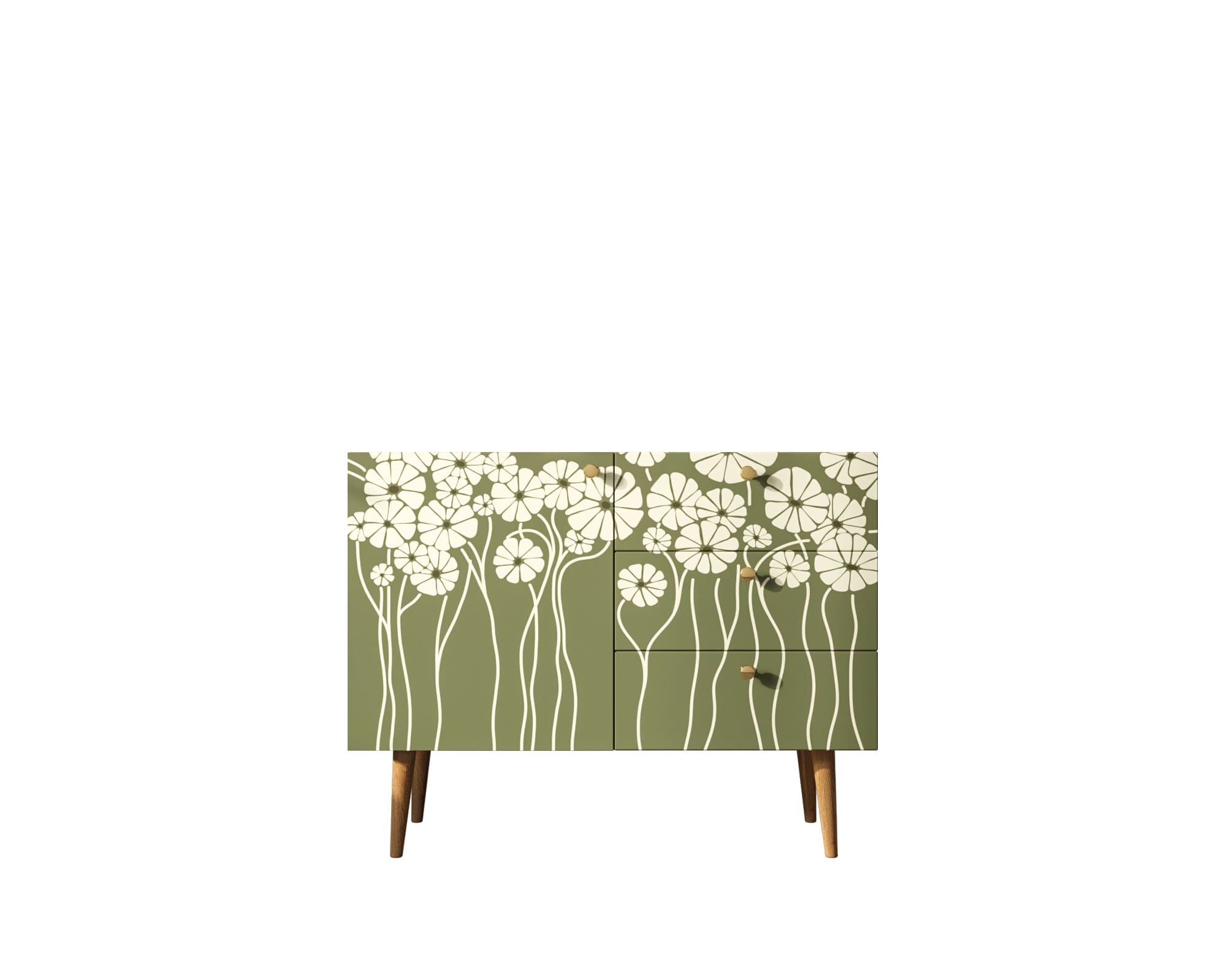 В компактном комоде три ящика и полка в левой секции за дверкой. Фасад украшает принт в спокойных тонах. Петли на дверях с доводчиком, ящики на шариковых направляющих. Для изготовления модели применены два вида материалов: ЛДСП для корпуса и массив ясеня для ножек.