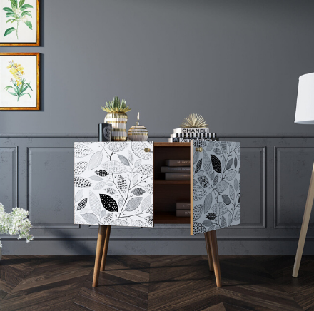 Корпус и ящики изготавливаются из ЛДСП австрийской компании "EGGER". Ножки мы делаем из массива ясеня и крепим на стальную пластину, на дверях петли с доводчиком а на ящиках шариковые направляющие. Принт на фасады наносится принтером специальными УФ - чернилами.