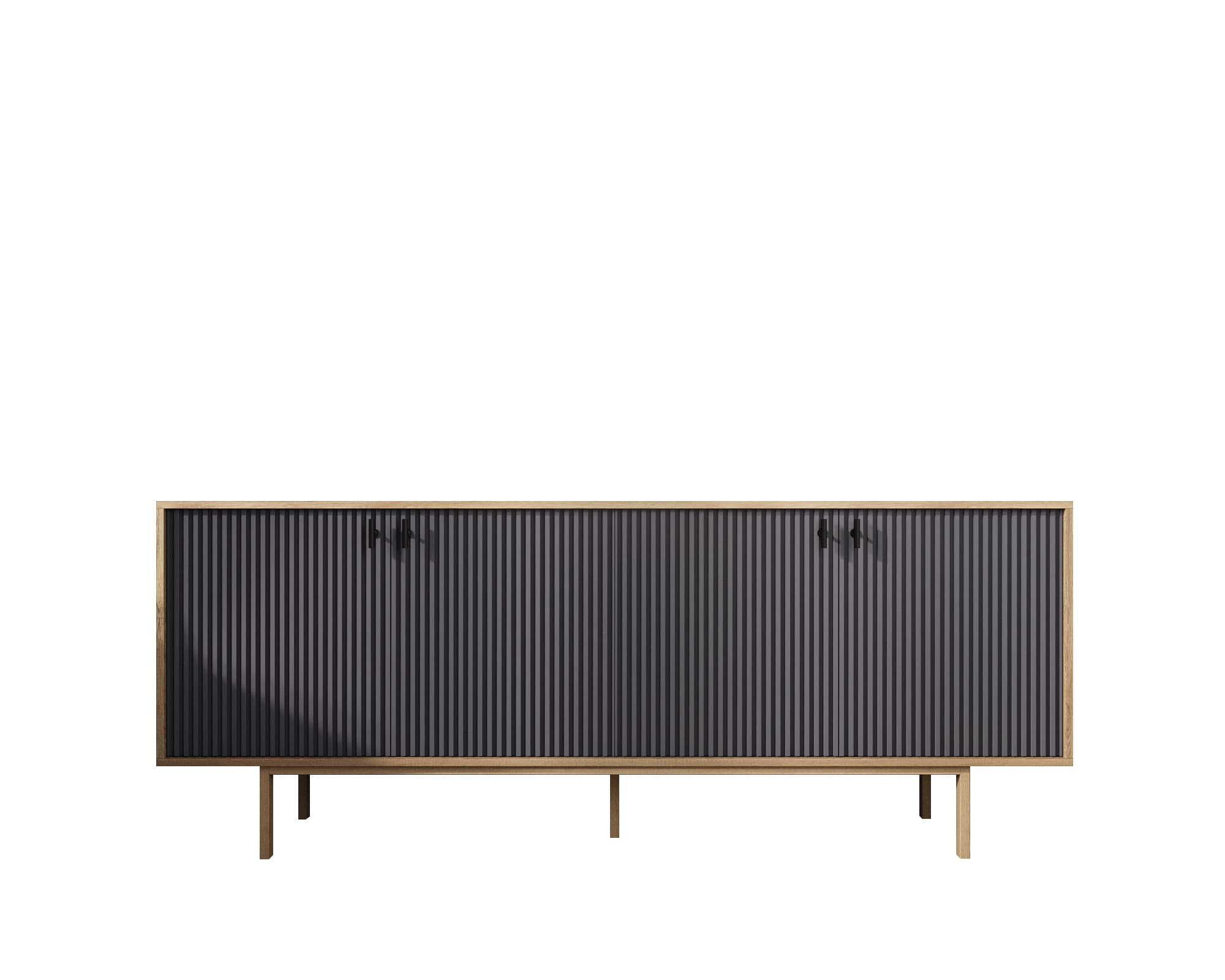 Комод в скандинавском стиле "Emerson" в черном корпусе имеет четыре дверки на петлях с доводчиком. Ниша внутри поделена на две секции съемной полкой. Ножки сделаны из массива дерева, что обеспечивает прочность платформы и покрыты темной морилкой. Цвет ножек или фасадов может быть изменен по вашему желанию .