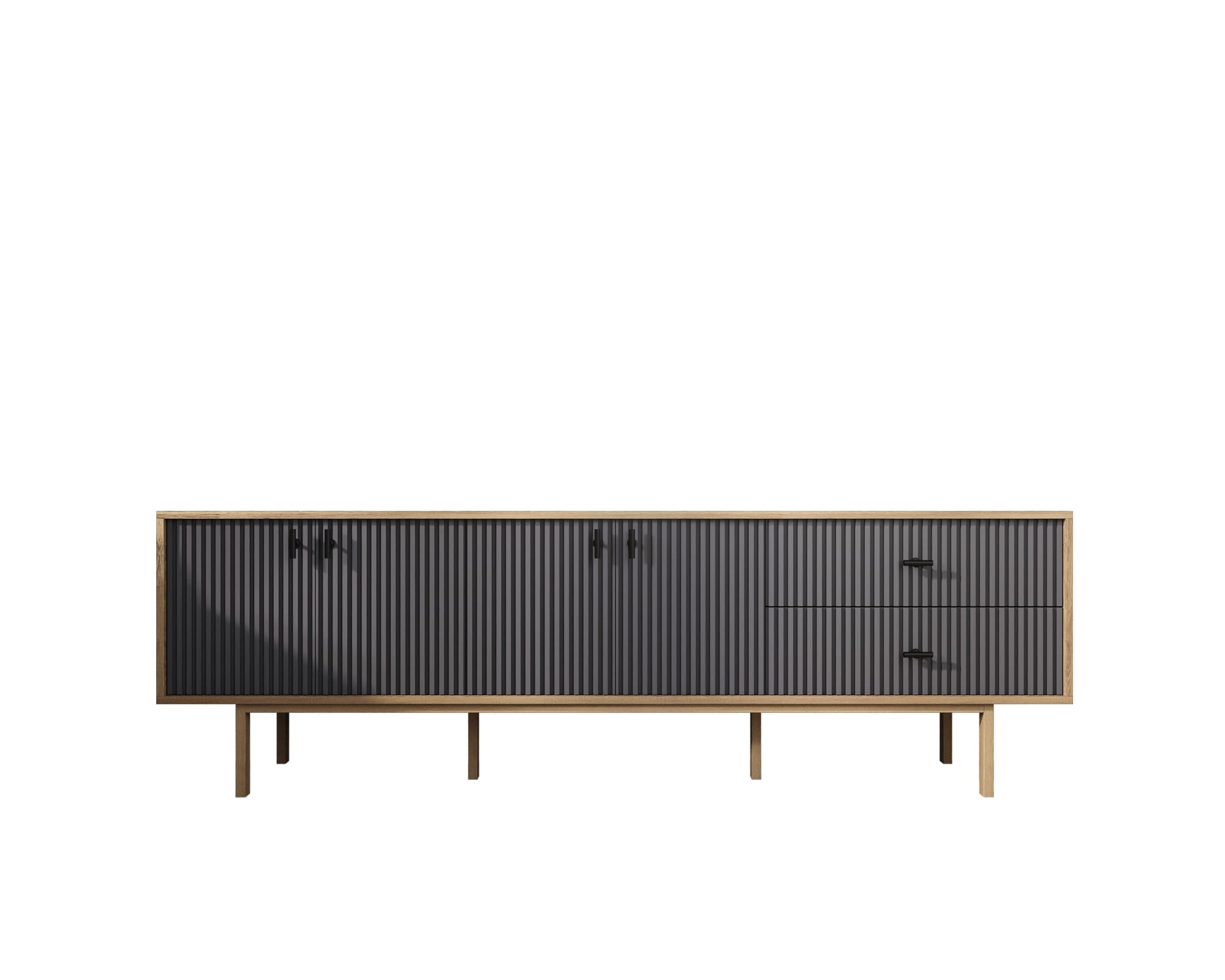 Комод в скандинавском стиле "Emerson" в черном корпусе имеет четыре дверки на петлях с доводчиком и два ящика с шариковыми направляющими легкого монтажа. Ниша внутри достаточно просторна и позволяет хранить коробки, белье и многое другое. Платформа на деревянных ножках обеспечивает устойчивость модели. Ручки изготовлены из металла.