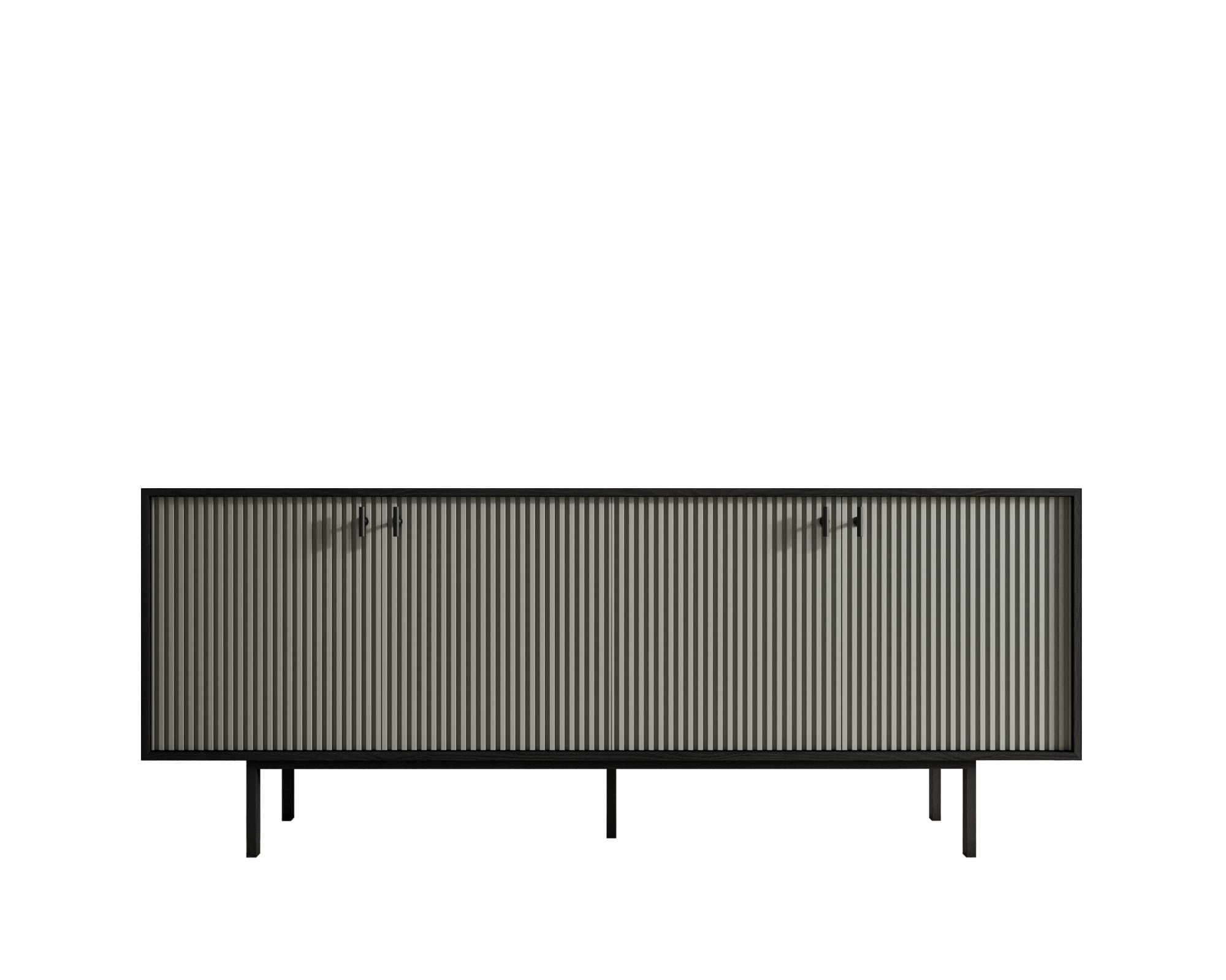 Комод в скандинавском стиле "Emerson" в тонком черном корпусе имеет четыре дверки на петлях с доводчиком. Ниша внутри поделена на две секции съемной полкой. Ножки сделаны из массива дерева, что обеспечивает прочность платформы и покрыты темной морилкой. Цвет ножек или фасадов может быть изменен по вашему желанию .