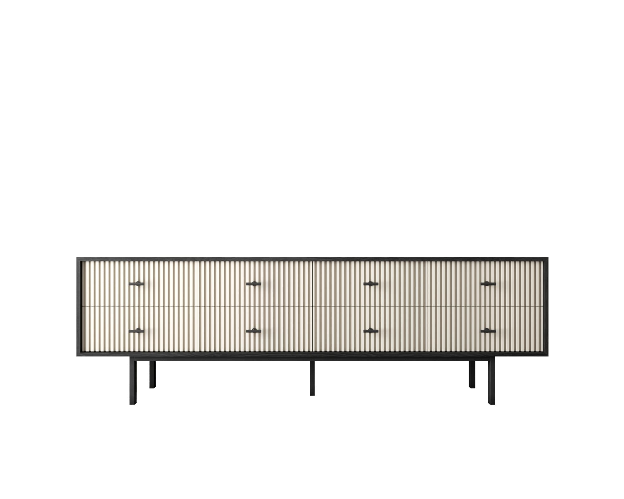 Комод в скандинавском стиле "Emerson" в черном корпусе имеет восемь ящиков на шариковых направляющих. Платформа на деревянных ножках. Ручки из металла.