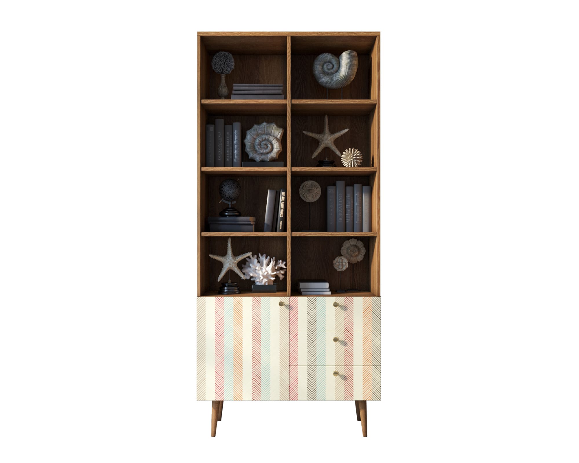 Стеллаж с дизайнерским принтом на фасаде имеет три небольших ящика полного выдвижения на шариковых направляющих. Левая секция за дверкой разделена полкой, которая регулируется по высоте. Ноги изготовлены из прочного массива ясеня.