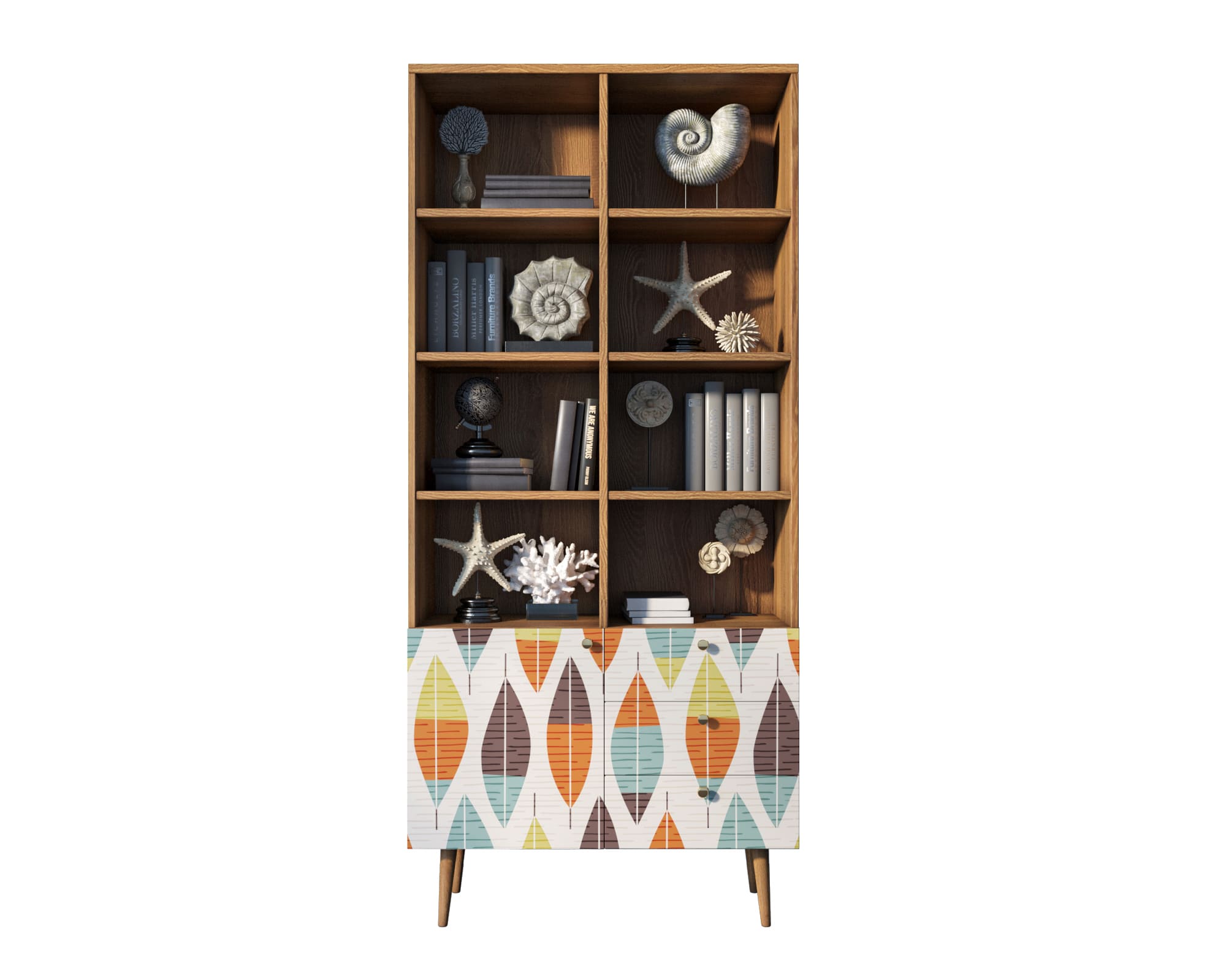 Стеллаж с дизайнерским принтом на фасаде имеет три небольших ящика полного выдвижения на шариковых направляющих. Левая секция за дверкой разделена полкой, которая регулируется по высоте. Ноги изготовлены из прочного массива ясеня.