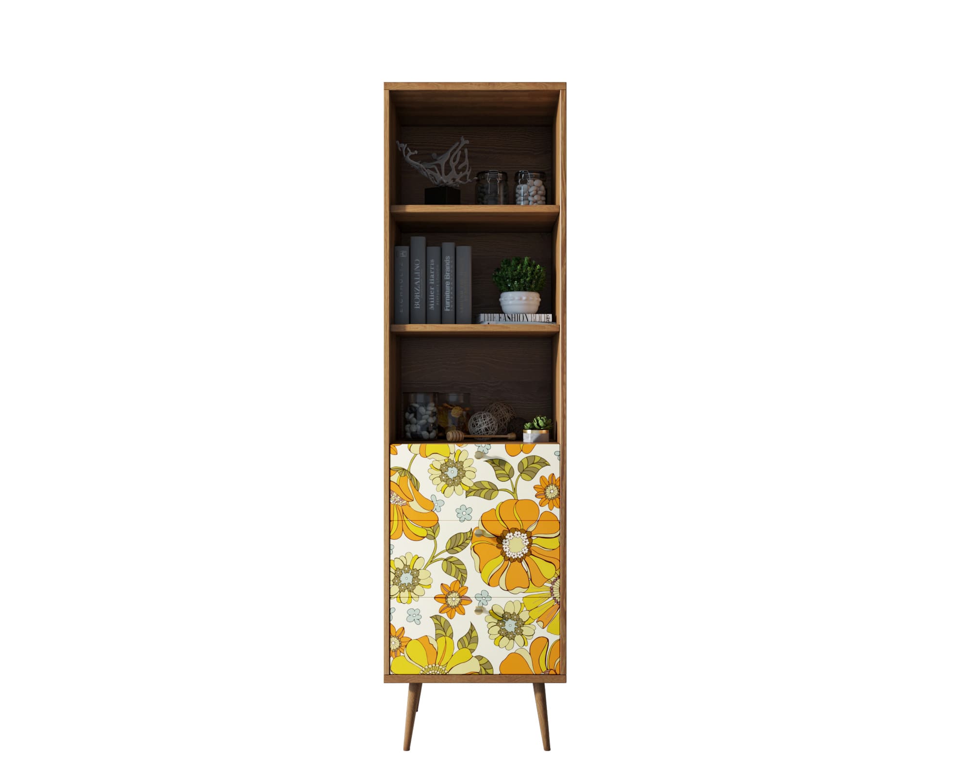 Узкий стеллаж с дизайнерским принтом на фасаде имеет три небольших ящика полного выдвижения на шариковых направляющих. Ноги изготовлены из прочного массива ясеня. Принт можно изменить по вашему желанию.