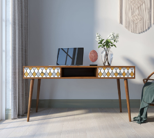 Благодаря изящным высоким ножкам, мебель визуально не загромождает пространство. Габариты столешницы при этом довольно внушительны (150х75 см). Фасады ящиков декорированы геометрическим рисунком. Стол Berber можно также заказать с любым принтом по вашему выбору. Рисунок наносится безопасными УФ-чернилами.