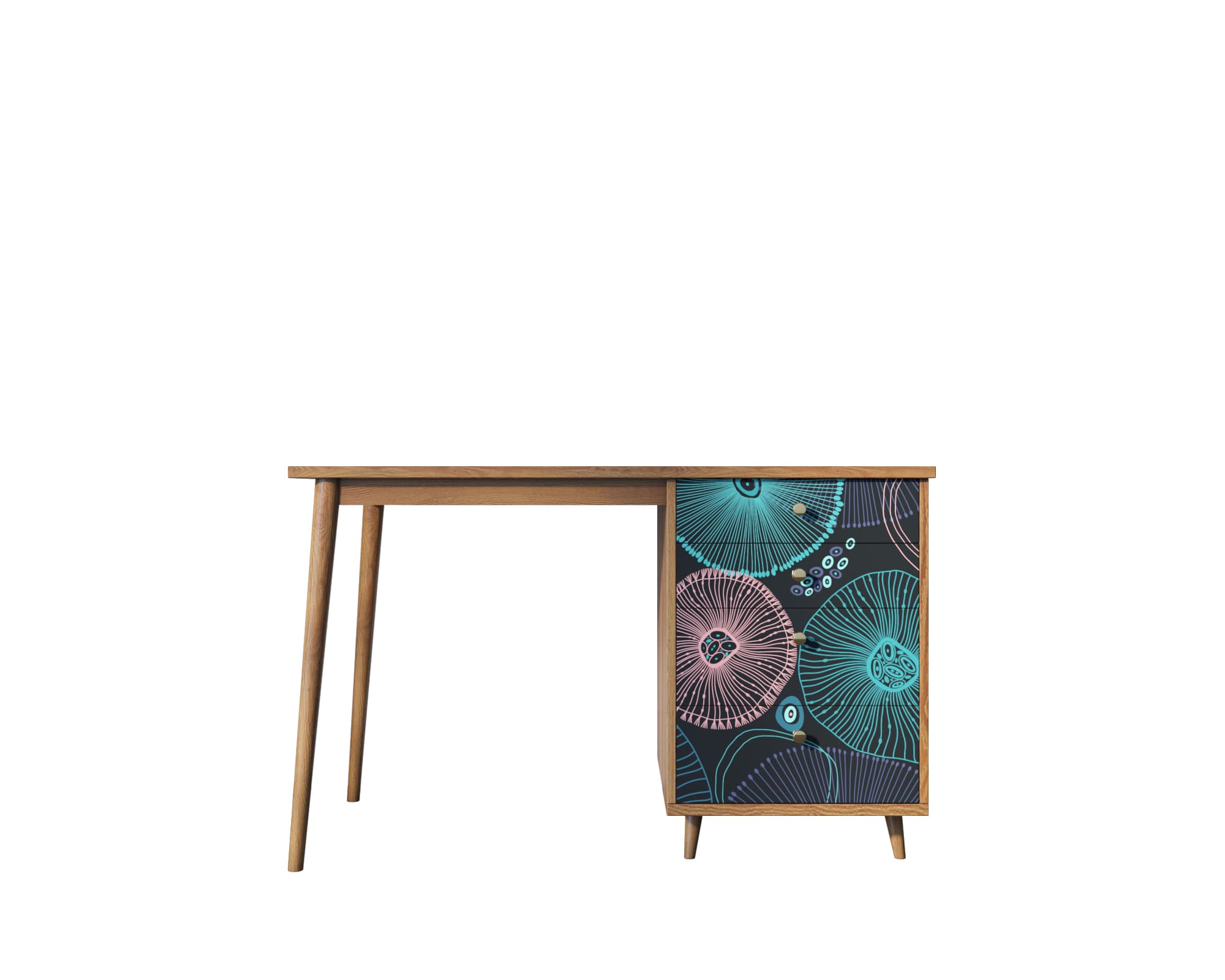 Рабочий стол "Berber" имеет четыре ящика на шариковых направляющих, цельное подстолье из натурального ясеня для улучшения устойчивости и дизайнерский принт на фасаде, который можно заменить по вашему желанию.