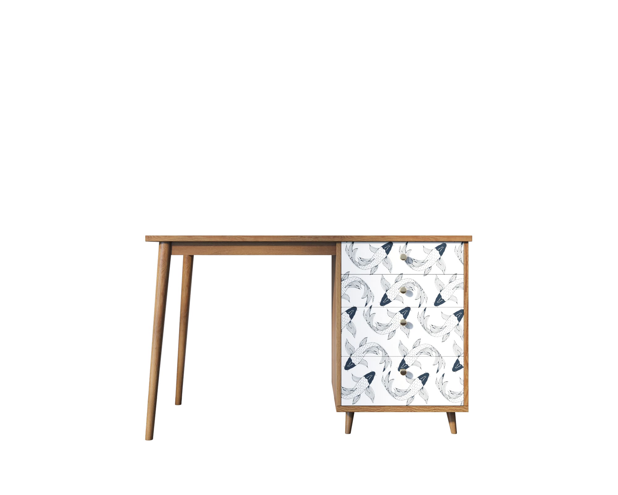 Рабочий стол "Berber" имеет четыре ящика на шариковых направляющих, цельное подстолье из натурального ясеня для улучшения устойчивости и дизайнерский принт на фасаде, который можно заменить по вашему желанию.