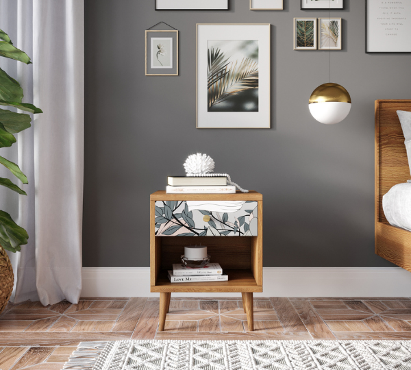Тумбочка на четырех высоких ножках в скандинавском стиле. Корпус модели прямоугольной конфигурации. В нем установлен один ящик с ручкой и открытая глубокая полка. Фасад ящика украшен принтом в спокойной гамме оттенков и узоров.